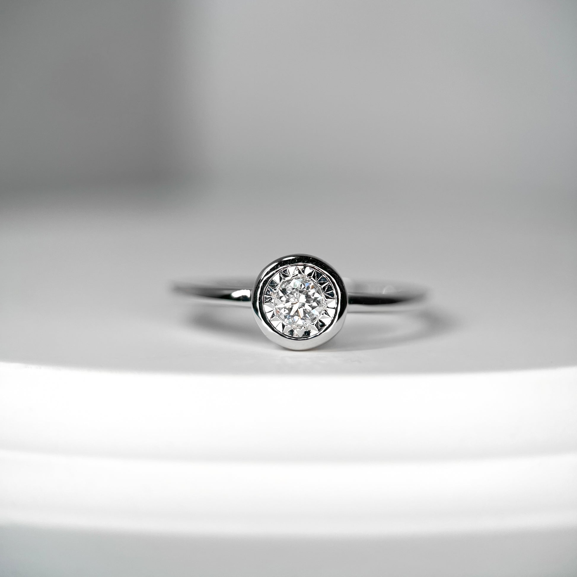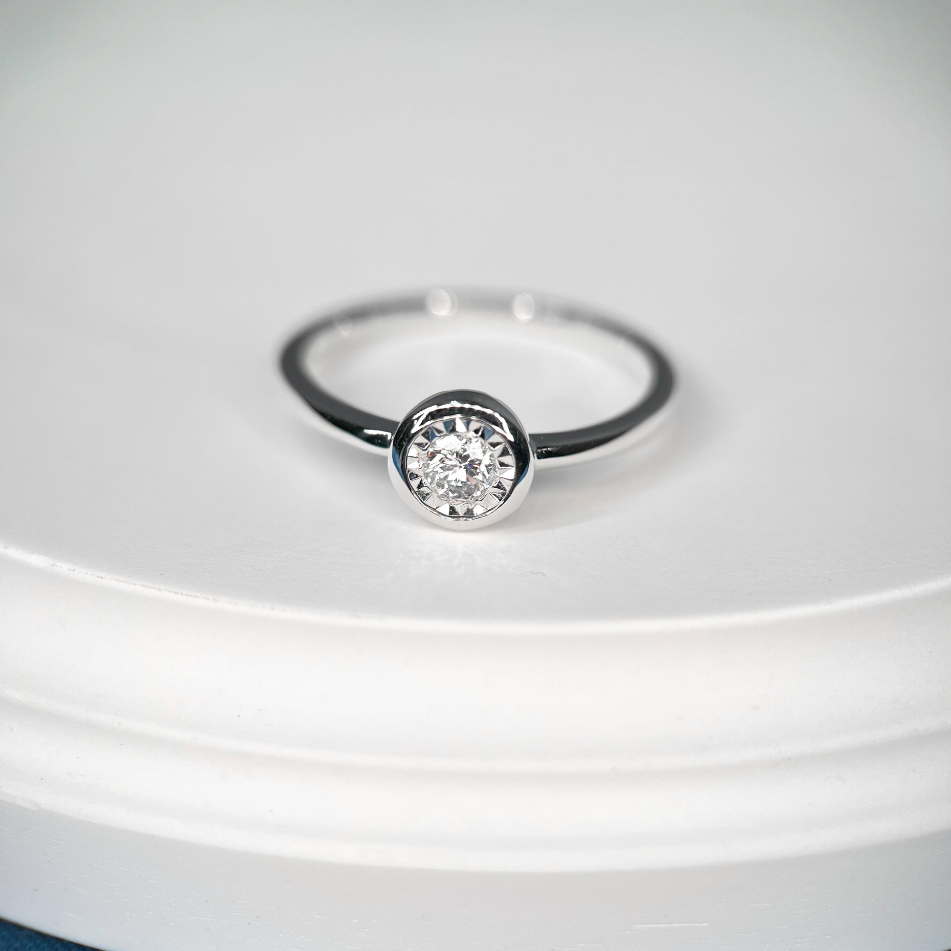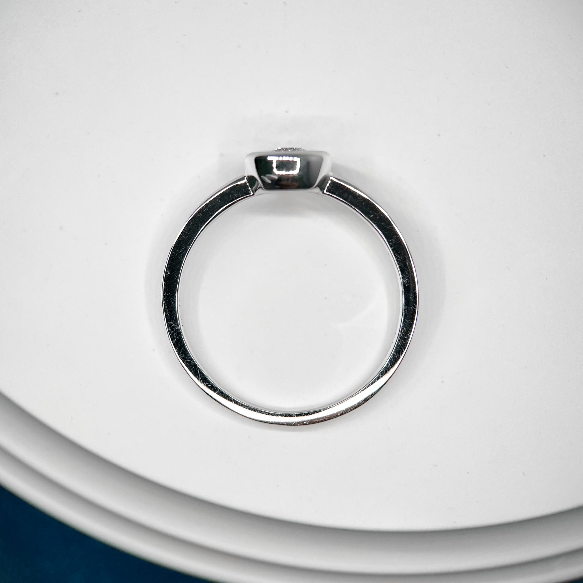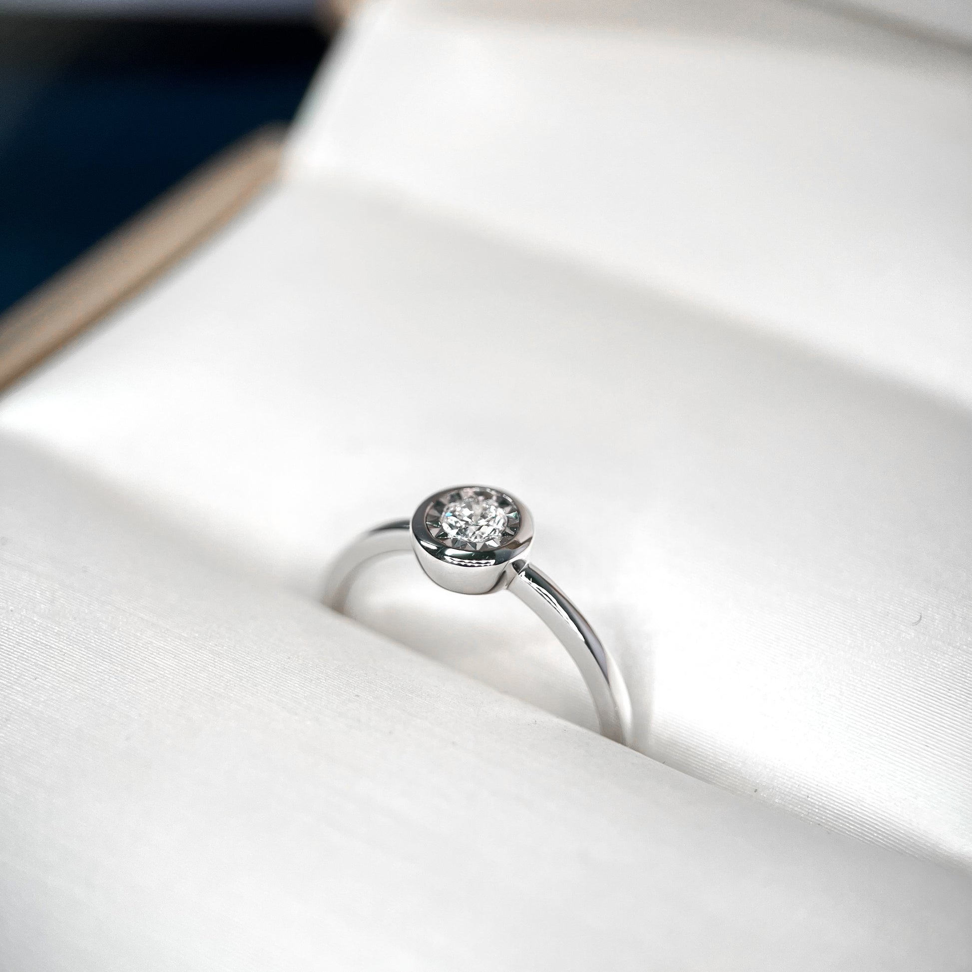 一顆簡潔的大圓鑽,收於光滑包邊設計中,如水面映月,純淨、安定,卻藏著堅定自持的力量。屬於低調者的奢華,為內心的光芒發聲。